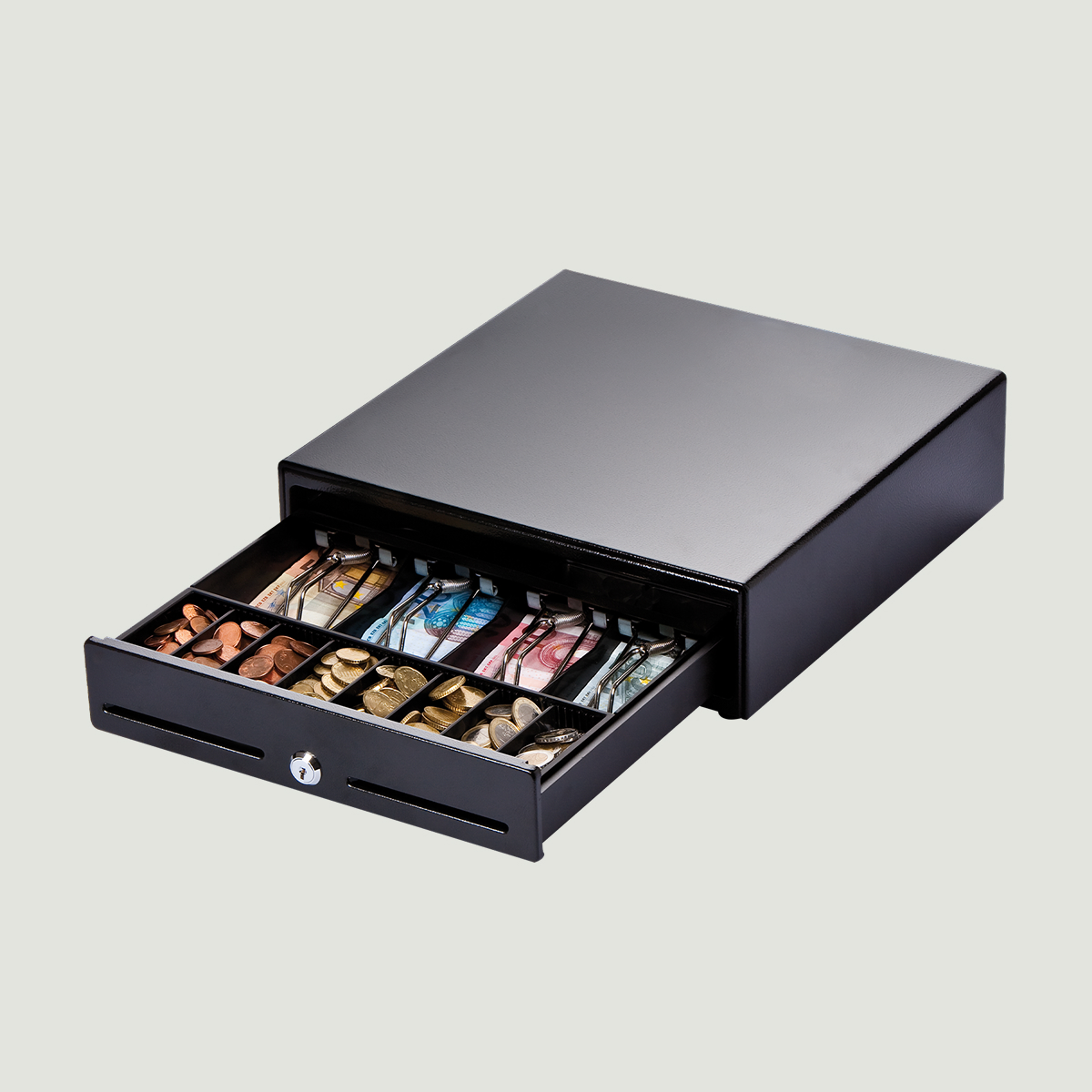 Die acht Münzfächer sind in der Größe flexibel untereinander aufzuteilen und so an jede Anforderung kinderleicht anzupassen. Die vier horizontalen Scheinfächer sind nicht nur optimiert auf Euro-Banknoten, sondern problemlos variabel für eine große Anzahl von Währungen einzusetzen.