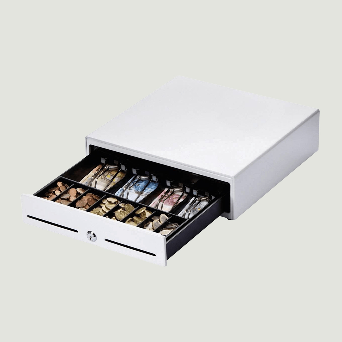 Miniatur-Kassenschublade mit enorm kleinen Abmessungen. Mit gerade einmal 330 x 330 x 101 mm macht sie sich an jedem Kassenplatz unauffällig klein.